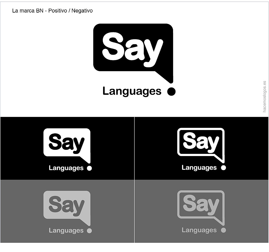 El propio nombre de la empresa parecía estarlo «diciendo»: enséñame como lo hablo. Luego buscamos un fuerte impacto perceptivo y decidimos que podíamos aprovechar la cortedad del nombre en beneficio de ese objetivo negativizándolo en la figura-bocadillo y usando una tipografía «blod» para realzar su presencia. Tras varios bocetos concluimos que era mejor sacar fuera del bocadillo la parte verbal que aportaba la especificidad (Languajes) presentado en una tipografía de palo seco (muy legible) y cerrar el discurso icónico de la marca con la presencia de un punto-círculo hacia el que se dirige el nombre de la empresa.